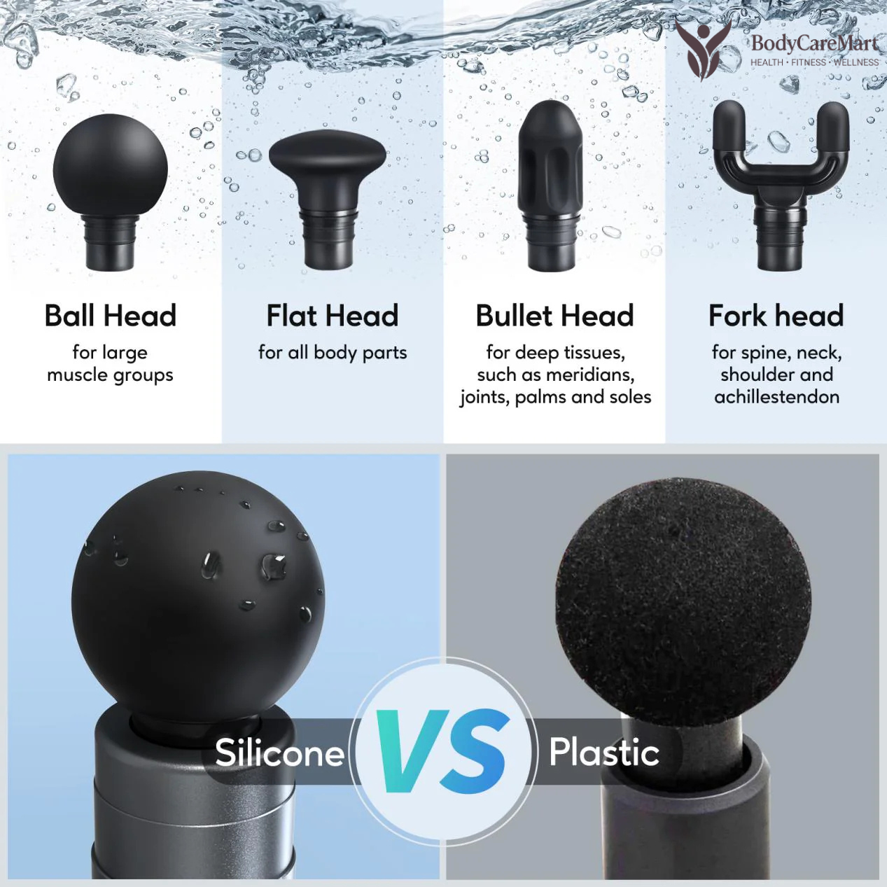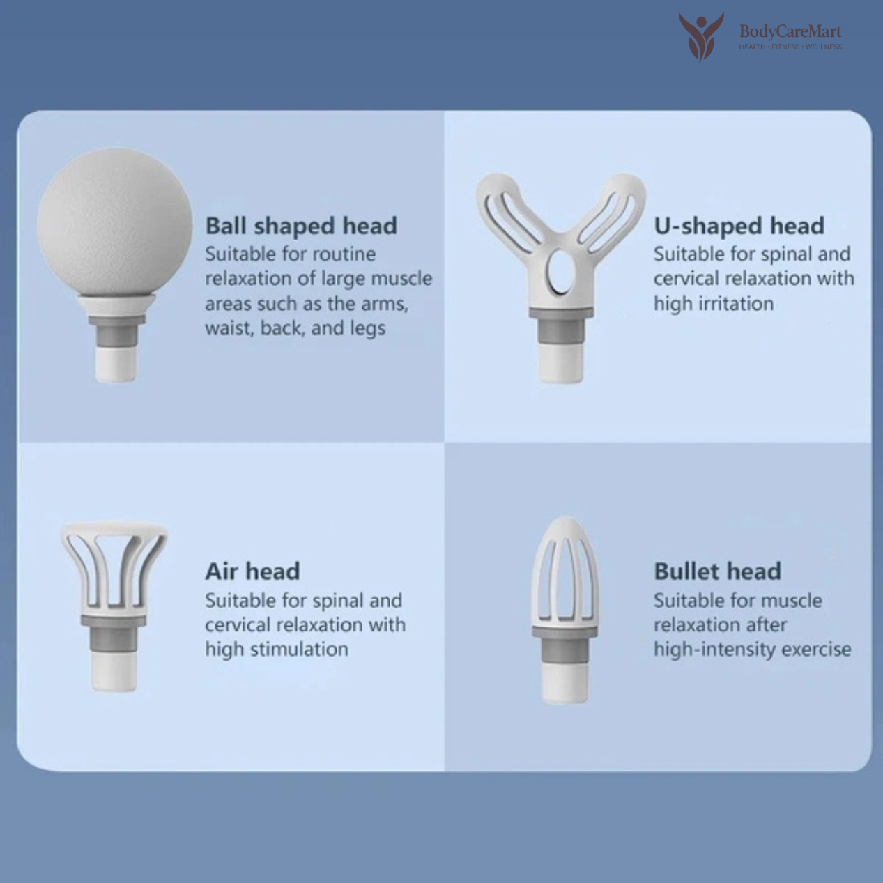 The Ball Head is designed for larger muscle groups, providing a smooth and evenly distributed massage.